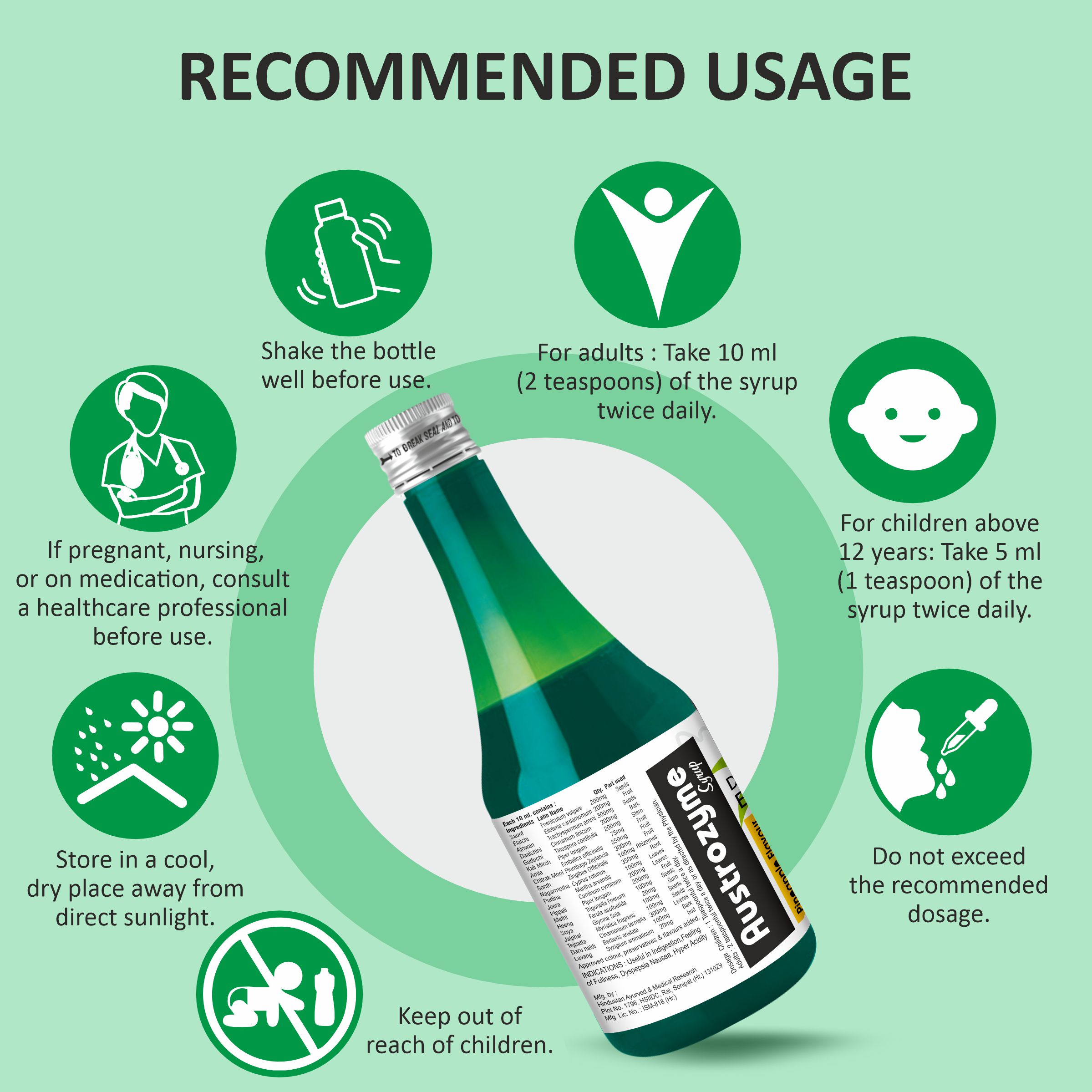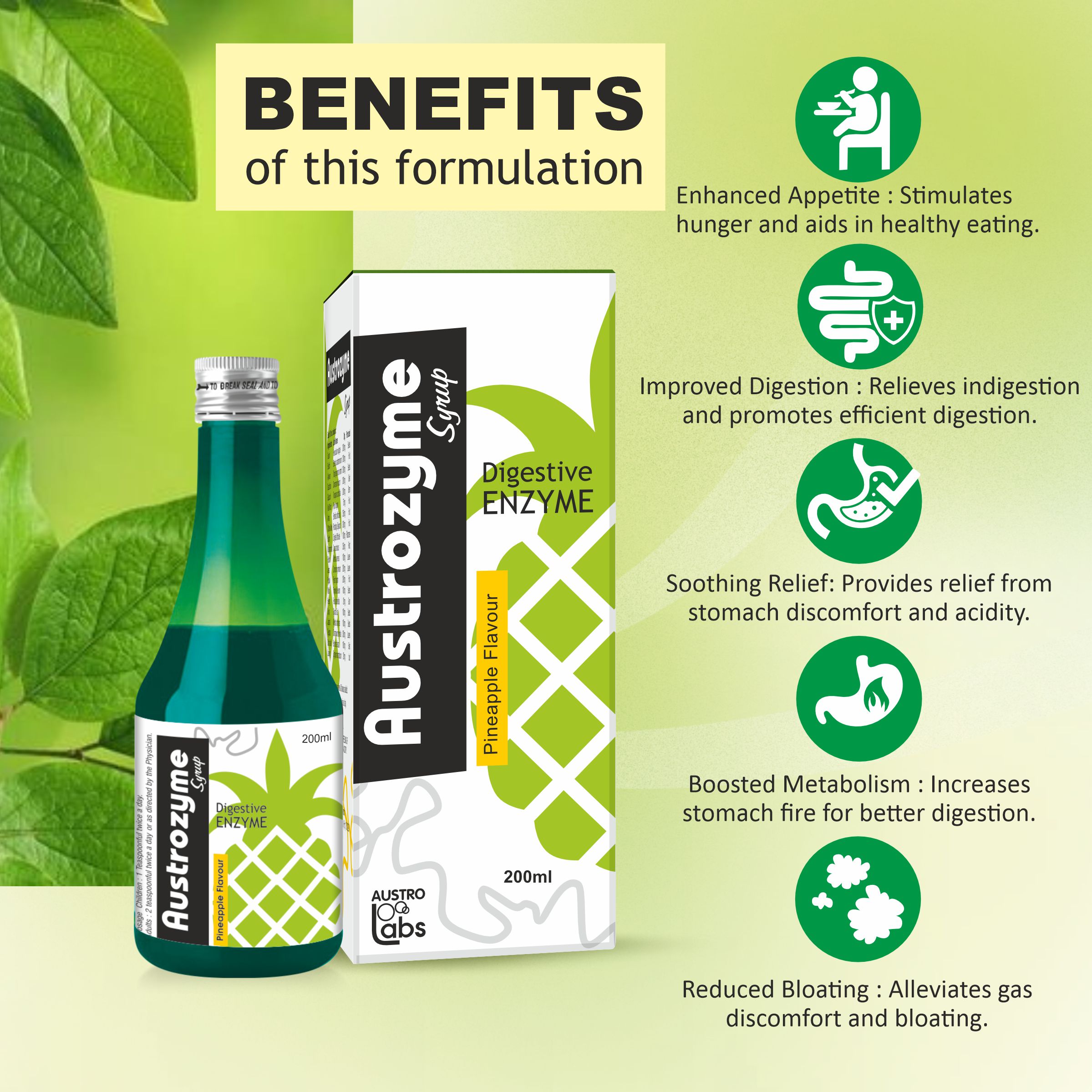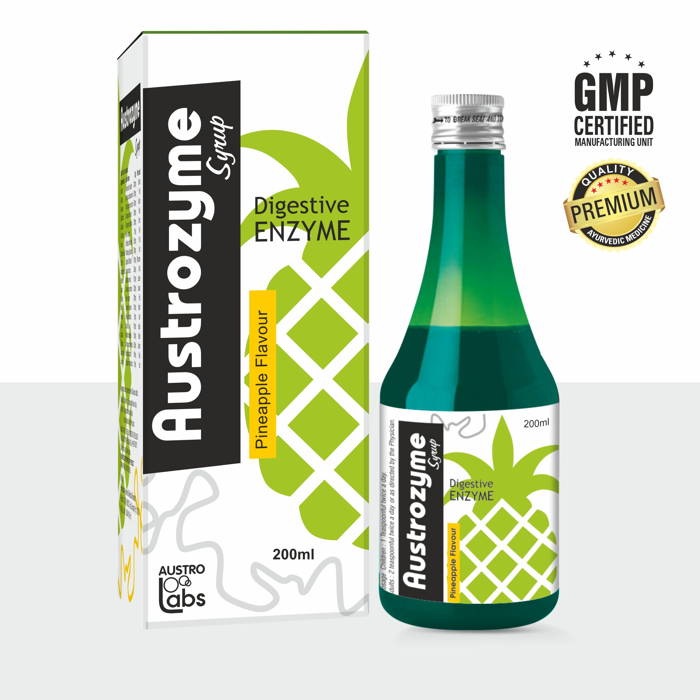 AUSTROZYME Syrup is a meticulously crafted blend of digestive spices and herbs, including Saunf, Ajowan, and Guduchi, designed to promote optimal digestive health. Enriched with traditional ingredients like Chitrak Mool, Amla, and Daru Haldi, this syrup offers a flavorful solution for digestive comfort. With a thoughtful combination of natural elements, AUSTROZYME Syrup provides a holistic and palatable approach to support your digestive well-being.